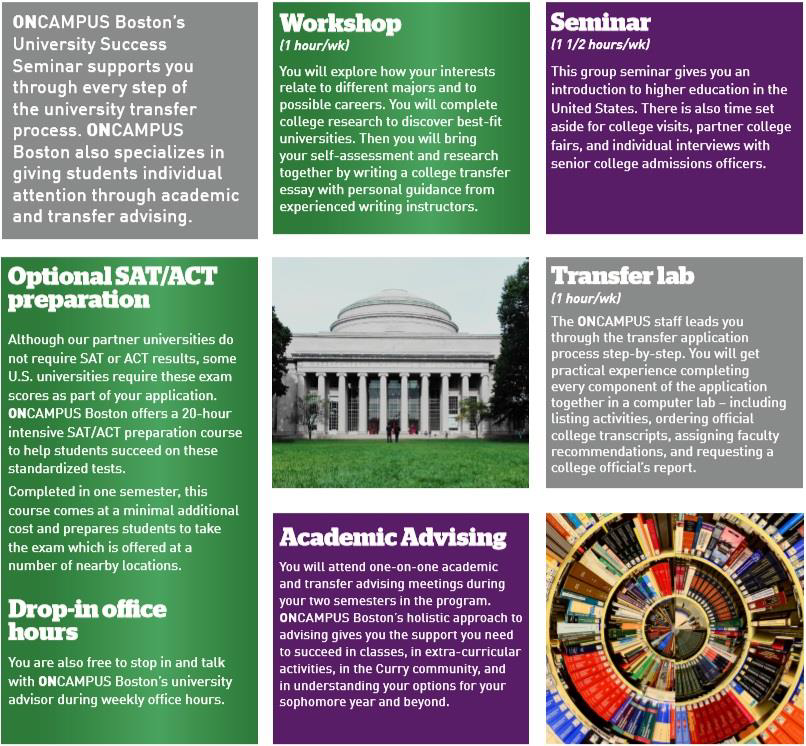• 온캠퍼스 보스턴은 미국 유학 준비가 다소 부족한 국제 학생들을 위한 편입 전문 프로그램으로 1년 간의 학업을 통해 원하는 학교로의 진학 및 성공적인 유학을 위한 첫 걸음