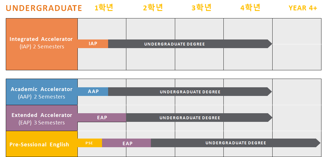 | TOEFL iBT 68점 (영역별 14점) IELTS 5.5점 (영역별 5.0점) | TOEFL iBT 60점 (영역별 12점) IELTS 5.0점 (영역별 4.5점) | TOEFL iBT 60점 미만 IELTS 5.0점 미만 |